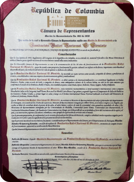 Presented by the Congress of the Republic of Colombia – House of Representatives to the Ballet Nacional El Firulete in celebration of its 20th anniversary and artistic legacy.