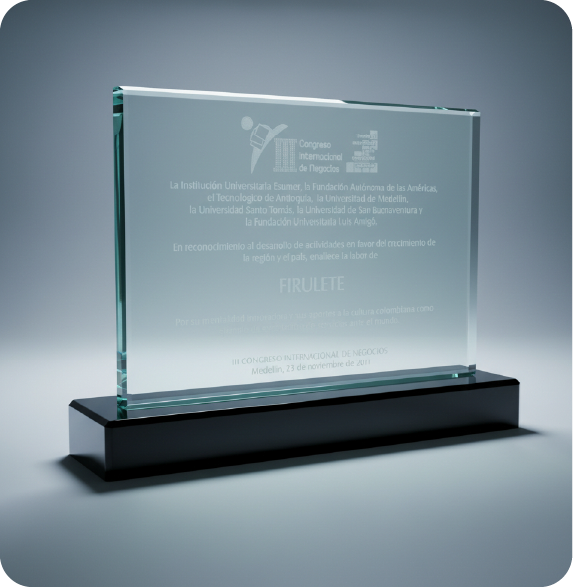 Granted by Universidad ESMER, Fundación Autónoma de las Américas, Tecnológico de Antioquia, Universidad de Medellín, Universidad Santo Tomás, Universidad San Buenaventura, and Fundación Universitaria Luis Amigó, honoring El Firulete for its innovative mindset and significant contributions to Colombian culture as an export-oriented cultural service to the world. 3rd International Business Congress.